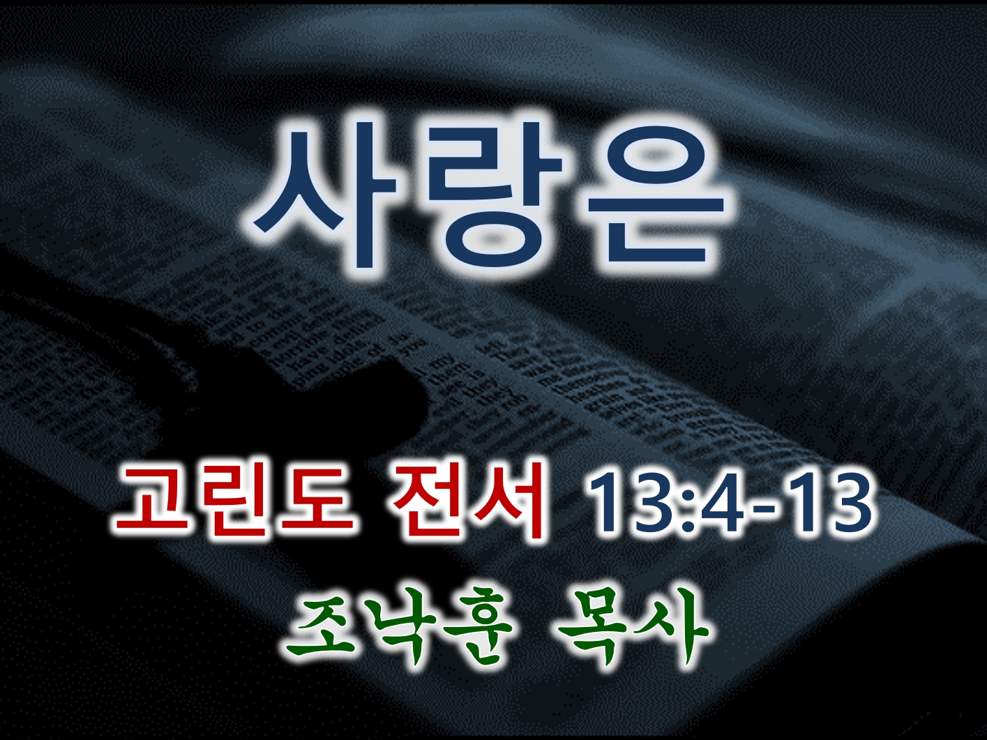 [성경본문] 고린도전서13:4-13절 개역개정4. 사랑은 오래 참고 사랑은 온유하며 시기하지 아니하며 사랑은 자랑하지 아니하며 교만하지 아니하며 5. 무례히 행하지 아니하며 자기의 유익을 구하지 아니하며 성내지 아니하며 악한 것을 생각하지 아니하며 6. 불의를 기뻐하지 아니하며 진리와 함께 기뻐하고 7. 모든 것을 참으며 모든 것을 믿으며 모든 것을 바라며 모든 것을 견디느니라 8. 사랑은 언제까지나 떨어지지 아니하되 예언도 폐하고 방언도 그치고 지식도 폐하리라 9. 우리는 부분적으로 알고 부분적으로 예언하니 10. 온전한 것이 올 때에는 부분적으로 하던 것이 폐하리라 11. 내가 어렸을 때에는 말하는 것이 어린 아이와 같고 깨닫는 것이 어린 아이와 같고 생각하는 것이 어린 아이와 같다가 장성한 사람이 되어서는 어린 아이의 일을 버렸노라 12. 우리가 지금은 거울로 보는 것 같이 희미하나 그 때에는 얼굴과 얼굴을 대하여 볼 것이요 지금은 내가 부분적으로 아나 그 때에는 주께서 나를 아신 것 같이 내가 온전히 알리라 13. 그런즉 믿음, 소망, 사랑, 이 세 가지는 항상 있을 것인데 그 중의 제일은 사랑이라