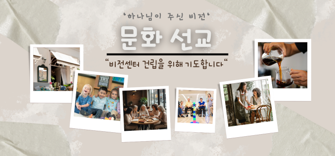 하나님이 우리에게 주신 아름다운 비전, '문화선교'를 향해 나아갑니다. *'크리스천 카페'를 통해 따뜻하고 편안한 공간 창조, 작은 공연도 만날 수 있기를 소망합니다. *오랜 인생길에 연약해지고 힘을 잃은 시니어들이 함께 웃으며 하나님의 축복을 나눌 수 있는 '시니어 센터'가 있으면 참 좋겠습니다. *열심히 달려야 하는 이민생활, 아이의 영성까지도 사랑으로 세워주는 '크리스천 데이캐어'가 더 많이 있으면 좋겠습니다.*장애우들이 함께 하고 건강한 사회인으로 세워질 수 있도록 돌보고 훈련하는 '장애우 센터'를 그려봅니다. *그리고 하나님께서 계속해서 새로운 비전과 사역으로 우리를 인도하시리라 믿습니다. 우리와 같은 비전을 가진 꿈의 사람들과 합력하여 비전센터를 건립하고 함께 협력하며 하나님이 보시기에 아름다운 동행을 하려고 합니다. 기도해 주