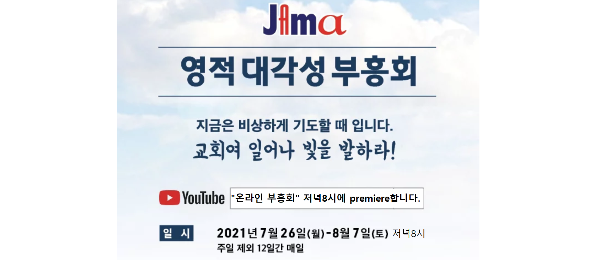 | 공지 | JAMA 영적 대각성 부흥회 | 운영자 | 2021-07-04 | ||